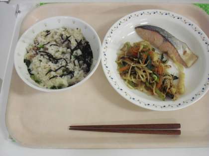 献立は、【冷やし梅茶漬け、魚の塩焼き、カリカリ油揚げと野菜のひたし、牛乳】です。冷やし梅茶漬けは、茶飯に梅とごまを炒ったふりかけと、冷たいだし汁と、のりをかけて食べます。