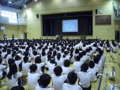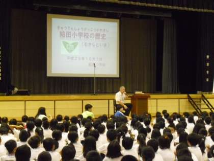 10月7日(月)の朝会は、校長から、給田小学校の歴史についてのお話をしました。