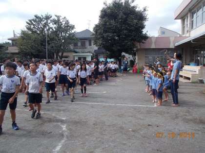 10月7日(月)中休みの時間を使って、5年生は、給田幼稚園の年長児のソーラン節を見に行きました。