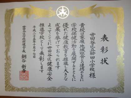 これは、給田小学校が、世田谷区学校保健会から、健康安全教育推進の功績で表彰されたものです。