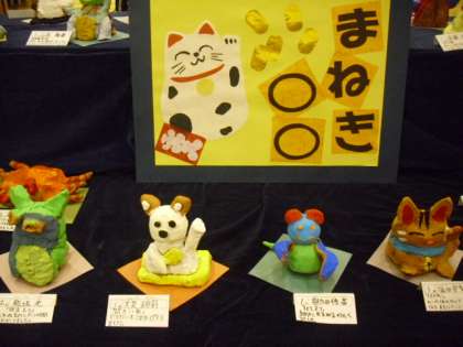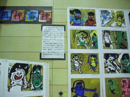 展覧会、5年生の出品は、平面作品「風神・雷神」、立体作品「招き○○」、共同テーマ作品「楽しい一輪車(ゆらゆらモビール)」、家庭科作品「みんなの顔・わくわくミシン」です。