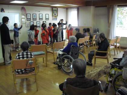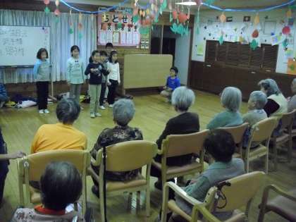 数人のグループで、事前に計画・練習した歌、ダンス、リコーダー演奏などを披露し、喜んでいただきました。