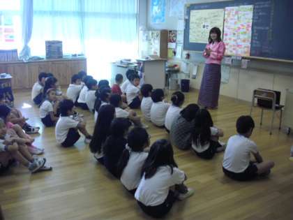 担任が「ブータン」の民族衣装を着て、クイズを交えながら楽しい授業を行いました。