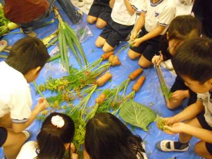 実際に、朝、収穫した人参、大根、ブロッコリー等を見せていただきながら、野菜を育て、収穫するお話をしていただきました。