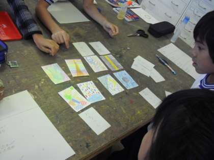 クラスのみんなで言葉を8つ出し合って、その言葉のイメージに合った色や形、模様があるカードを一人一人がつくりました。同じ言葉でも、いろいろなカードが出来上がり、グループで友達のカードの当てっこゲームをやりました。「希望、っていうカードはどれ?」「ああ、そんな感じ、するね!」