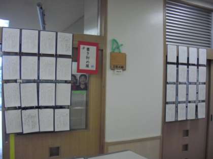 1・2年生は硬筆、3〜6年生は毛筆の書き初めが、各学級前の廊下に掲示してあります。