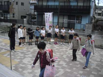 今朝、寒い中、代表の児童が元気よく、登校児童に挨拶をしてくれました。