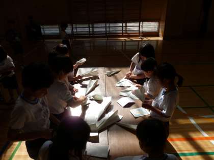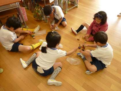 2年生から遊び方を教わり、竹とんぼやけん玉などの遊びに挑戦しました。