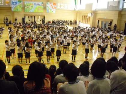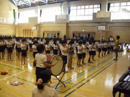 1年生は「大好き6年生(アイアイ替歌)」の歌、2年生は「心から心へ」の合奏と合唱を6年生に送りました。