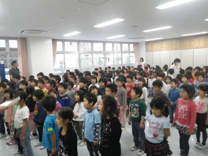 あすの“1年生を迎える会”に向けて、1年生はクラブ室(体育館横)で歌の練習をしました。