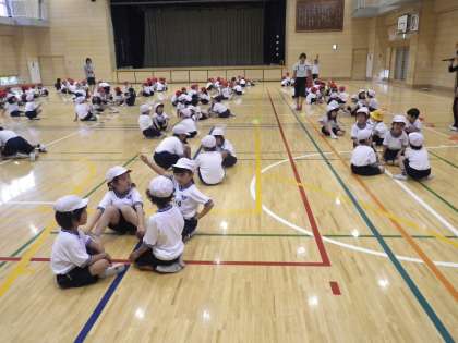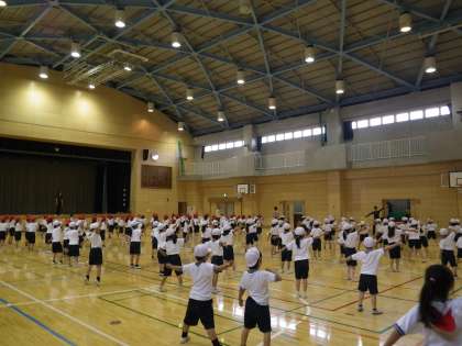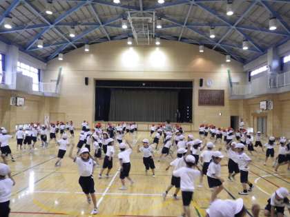 今日は体育館でダンスの練習をしました。4人組でいっしょに踊る場面や、4人組で「決め」のポーズをするために、子どもたちどうしでいろいろと相談をしたりしました。