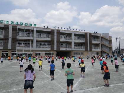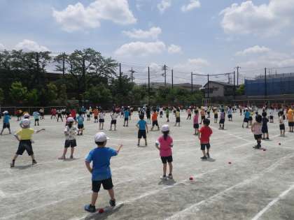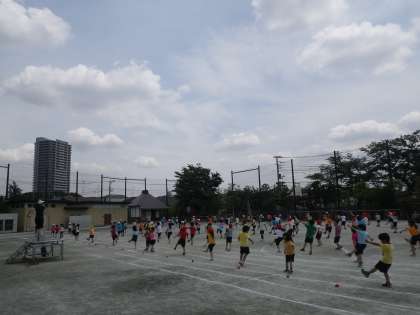 今日は本番と同じように、衣装を着てダンスを踊りました。カラフルなTシャツが校庭いっぱいに広がって、とても華やかでした。