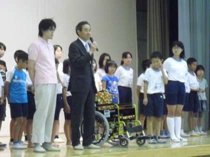 6月19日(木)の児童集会で、代表委員会の児童から、千歳敬心苑様に車椅子を贈呈しました。
