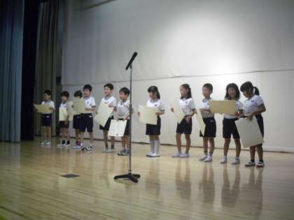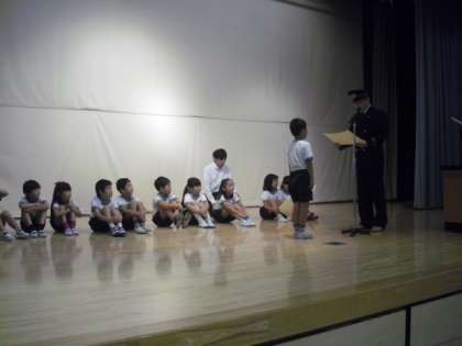 10月27日(月)朝会時、成城消防署の方が来てくださり、2年生の「はたらく消防写生会」の表彰を行いました。