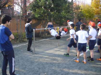 鉄棒を専門とする3名の方に講師に来ていただき、担任と一緒に指導していただきました。