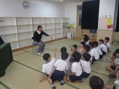 1年生 お話会 その2 公開日 2014/12/08 更新日 2014/12/08 1年 今回のお話会では、ドングリを使った手遊び歌も習いました。 さーて、右手・左手どちらにドングリが入っているかな? お話会の終わりにはサンタさんからのプレゼントで、かわいいドングリをもらいました。 いいね(0)