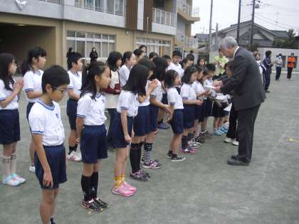 1月26日(月)朝会時に、世田谷区立小学校図画工作作品展に給田小学校代表として出品した児童に、出品者証を渡し、表彰しました。