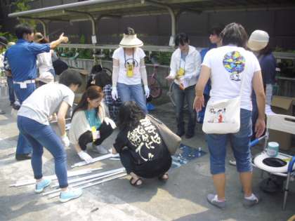 7月11日(土)午後、給田小学校のPTAを対象に、避難所訓練(資機材使用訓練)があり、30名をこえる方々が参加しました。