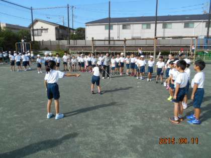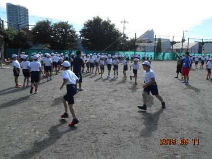 9/11 給田タイム 公開日 2015/09/11 更新日 2015/09/11 校長室 9月11日(金)朝、久しぶりの晴天の下、給田タイムを行いました。 1年生は体育館、2〜4年生は校庭、5・6年生は給田西公園に分かれ、長縄とびで汗を流しました。 いいね(0)