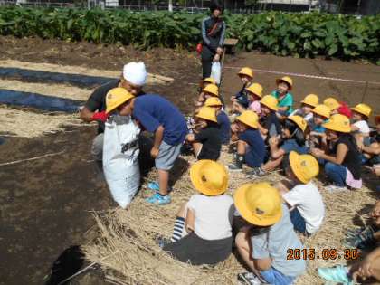 農家の方から、土づくりのお話から、大根の種まき、育て方の話をうかがい、ひとり2か所に、3粒の種をまきました。