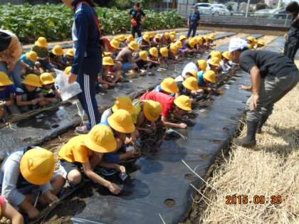9月30日(水)、2年生は、学校近くの畑で、大根の種まきをしました。