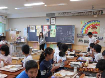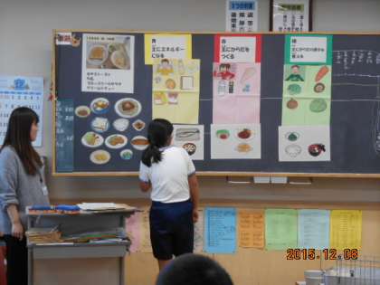 12月7日(月)給食の時間、6年生の学級で、栄養士の先生から食育(給食のメニューで、栄養素と食事バランス)についての指導がありました。