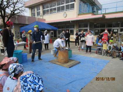 保護者の皆様、地域の皆様からご支援をいただき、園児のもちつき体験と試食ができました。