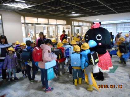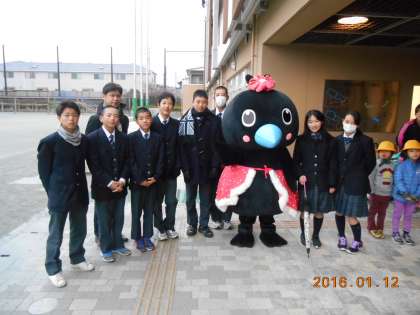 今朝の給田小学校には、挨拶週間ということで、烏山中学校の生徒の皆さんと烏山地区キャラクターのからぴょんが来てくれ、一緒に挨拶をしてくれました。