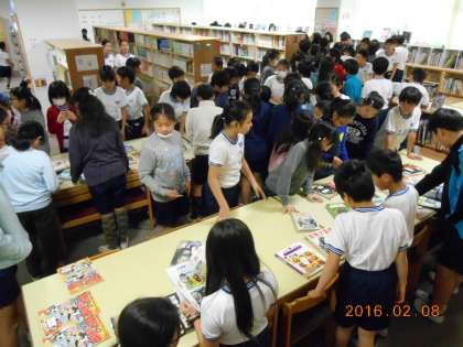 開催前には、図書室入口に、50人以上の児童が並び、盛況で、児童は思い思いに好きな本を選び、楽しそうでした。
