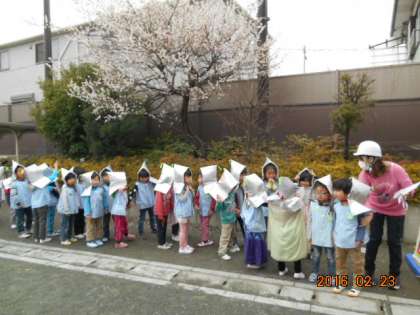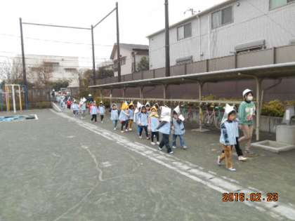 【幼稚園】2/23 避難訓練 公開日 2016/02/23 更新日 2016/02/23 給田幼稚園 給田幼稚園では、2月23日(火)避難訓練を行いました。 今回は、隣接する給田小学校への避難練習でした。 静かに、しっかりと歩いて、避難できました。 いいね(0)