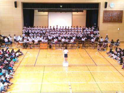 全校児童で体育館に集まり、1〜5年生の出し物、6年生と一緒のクイズとゲームなどで楽しみました。