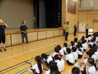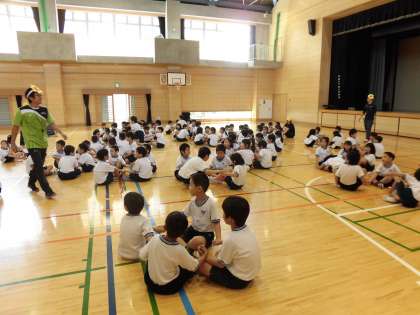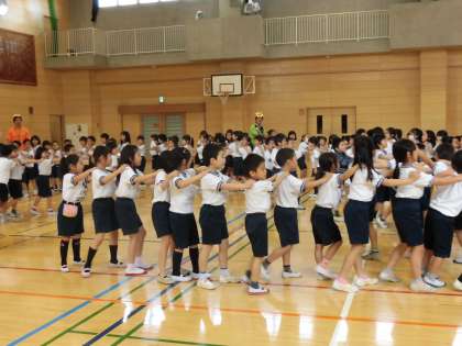 教員の自己紹介の後、じゃんけんれっしゃ、猛獣狩りに行こうよゲームをしました。学級を越えてグループを作ることができました。
