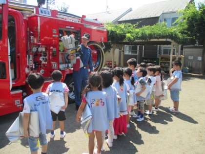 火災を想定しての避難訓練がありました。成城消防署の方に来ていただき、指導していただきました。その後、消防車見学も行い、車の仕組みや消防服について分かりやすく説明してくれました。