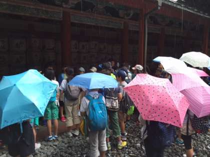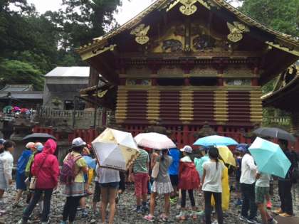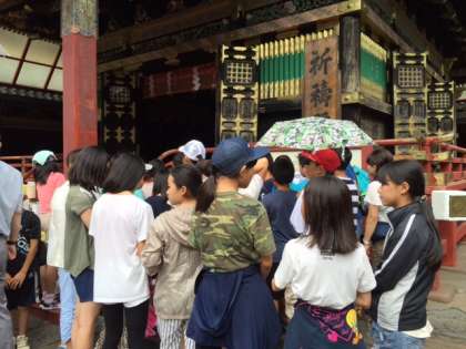 日光東照宮に来ています。今年はクラスごとに見学しました。クラスの中で班ごとに想像の象や三猿、鳴き竜などの場所をプレゼンテーションしました。クイズを出したり、絵を使ったりして各班工夫して発表していました。