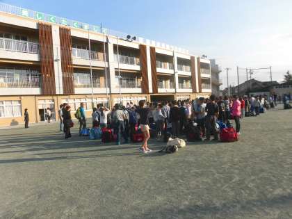 5年生は今日から川場移動教室です。校庭で出発式をして、バスに乗りました。