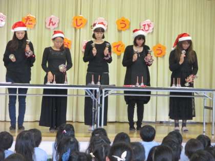 12月の誕生会をしました。お楽しみは、お母さんたちの出し物でした。ハンドベルの演奏、「ジングルベル」の合奏、「夢をかなえてドラえもん」の合唱と、子どもたちは嬉しそうに聴いていました。参加してくださったお母様方、ありがとうございました。