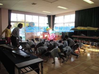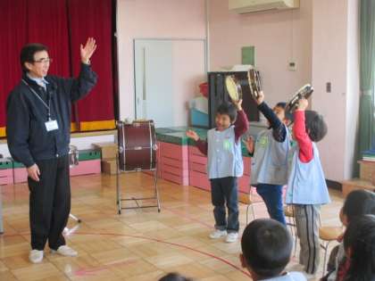 もうすぐ小学校生活を控えた年長児を対象に、給田小学校副校長大湊先生が音楽の特別授業をしてくださいました。楽器の扱い方やリズム遊びなど、体を動かしながら楽しく教わりました。大湊副校長先生、ありがとうございました。