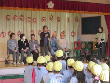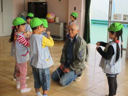 地域の給田福寿会の方が来てくださり、竹とんぼやこま、けん玉、おはじき、あやとり、折り紙、メンコなど昔遊びを教えてくださいました。初めての遊具に興味津々の子どもたち。福寿会の方が優しく丁寧に教えてくださったおかげで、竹とんぼやこまができるようになりました。ありがとうございました。