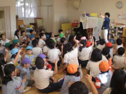 4年2組、4組の子供たちと給田幼稚園の年少さん(りす組、うさぎ組)との交流がありました。