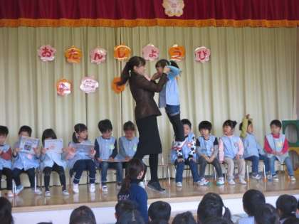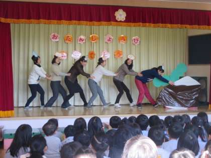 新学期初めての誕生会がありました。お友達に誕生日を祝ってもらい嬉しそうな子どもたちでした。お楽しみは、教師による劇「大きなかぶ」でした。