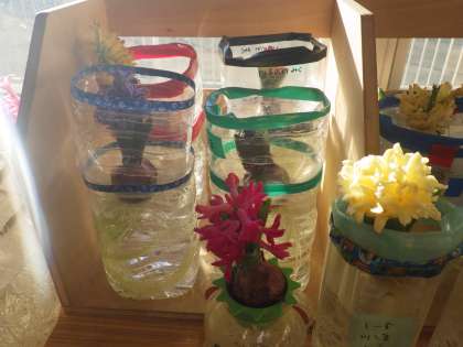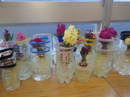 1年生はペットボトルを利用してヒヤシンスの球根を育てています。