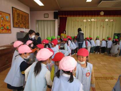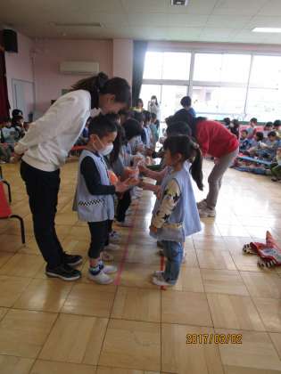 3/2 園児お別れ会 公開日 2017/03/29 更新日 2017/03/29 給田幼稚園 幼稚園ホールでお別れ会をしました。年長組にたくさんお世話になった年少組が感謝の気持ちを込めて会を開きました。年少児から歌と言葉、手作りの鉛筆立てをプレゼントしました。年長児からも歌と言葉、素敵な染めのハンカチをプレゼントされました。最後は「さよならみなさん」で年長と年少が握手やハイタッチをし合い、楽しく踊りました。 いいね(0)