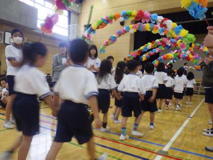 6年生が作ってくれたアーチをくぐって、全校児童の大きな拍手に迎えられて1年生が入場しました。