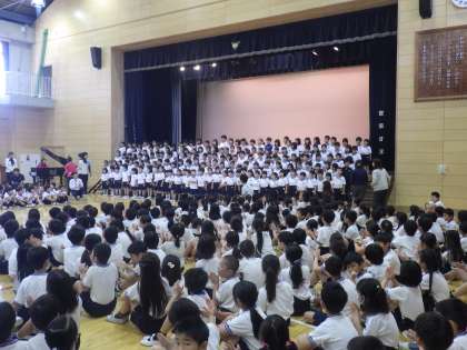 4月10日に対面式が行われ、1年生が体育館で全校児童と初めて顔を合わせました。
