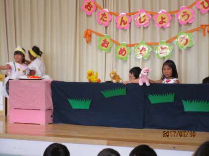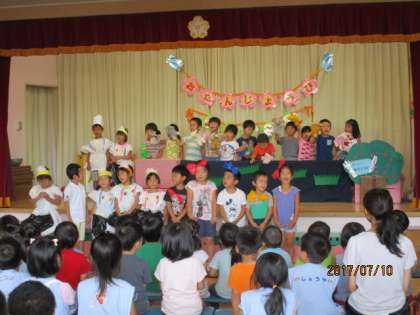 7月10日(月) 誕生会 公開日 2017/07/27 更新日 2017/07/27 給田幼稚園 7月生まれの誕生会がありました。お楽しみは、もも組の出し物でした。動物のパペットを使って「たんじょうびはなにたべる?」の劇に学級のみんなで挑戦しました。次々に出てくる動物や食べ物がとても素敵で、年少組も楽しんで観ていました。 いいね(0)