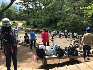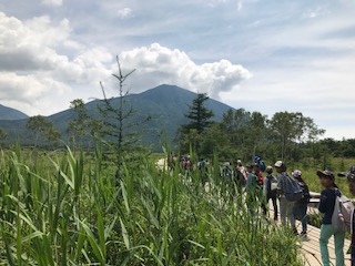 天気に恵まれた戦場ヶ原ハイキング。クラスごとに湯滝を見たり、木道を歩いたりしました。