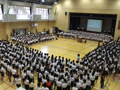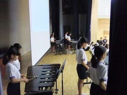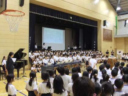 前期音楽委員の子ども達のリズムにのった伴奏に合わせ、全校児童が「いつだって」を歌いました。