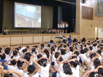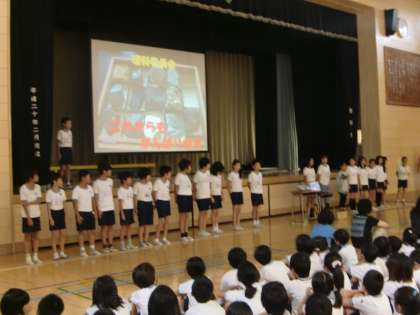発表は三択のクイズ形式で、理科の器具や実験に関する話が1年生にもよくわかるように工夫されていました。5・6年生はいわば「縁の下の力持ち」。学校のいろいろな場で、みんなのために奉仕的活動をしています。発表集会を通じてそのことが下級生にもよくわかり、進んで働く気持ちや感謝の気持ちを育てたいと思います。
