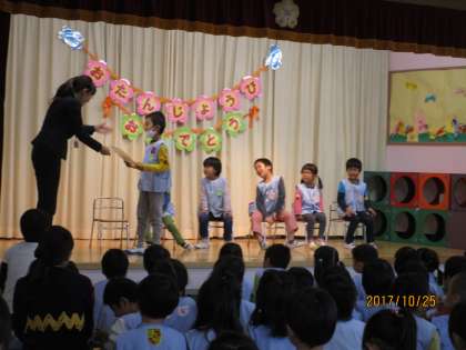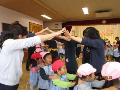 10月25日(水) 誕生会 公開日 2017/11/15 更新日 2017/11/15 給田幼稚園 10月生まれの友達をみんなでお祝いしました。司会はたけ組が行い、お楽しみでは年少・年長組のペア学級で「じゃんけん列車」をしました。じゃんけんをするごとに、どんどん電車がつながって、大興奮の子どもたちでした。最後は、みんながつながって1本の電車になり、園長先生や副園長先生のつくってくれたアーチトンネルをくぐりました。 いいね(0)