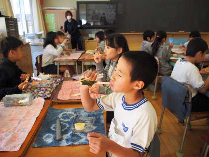 1年生から6年生まで、給田地域に伝わる「かけづき」によるもちつきを見学した後、つきたてのおもちを味わいました。